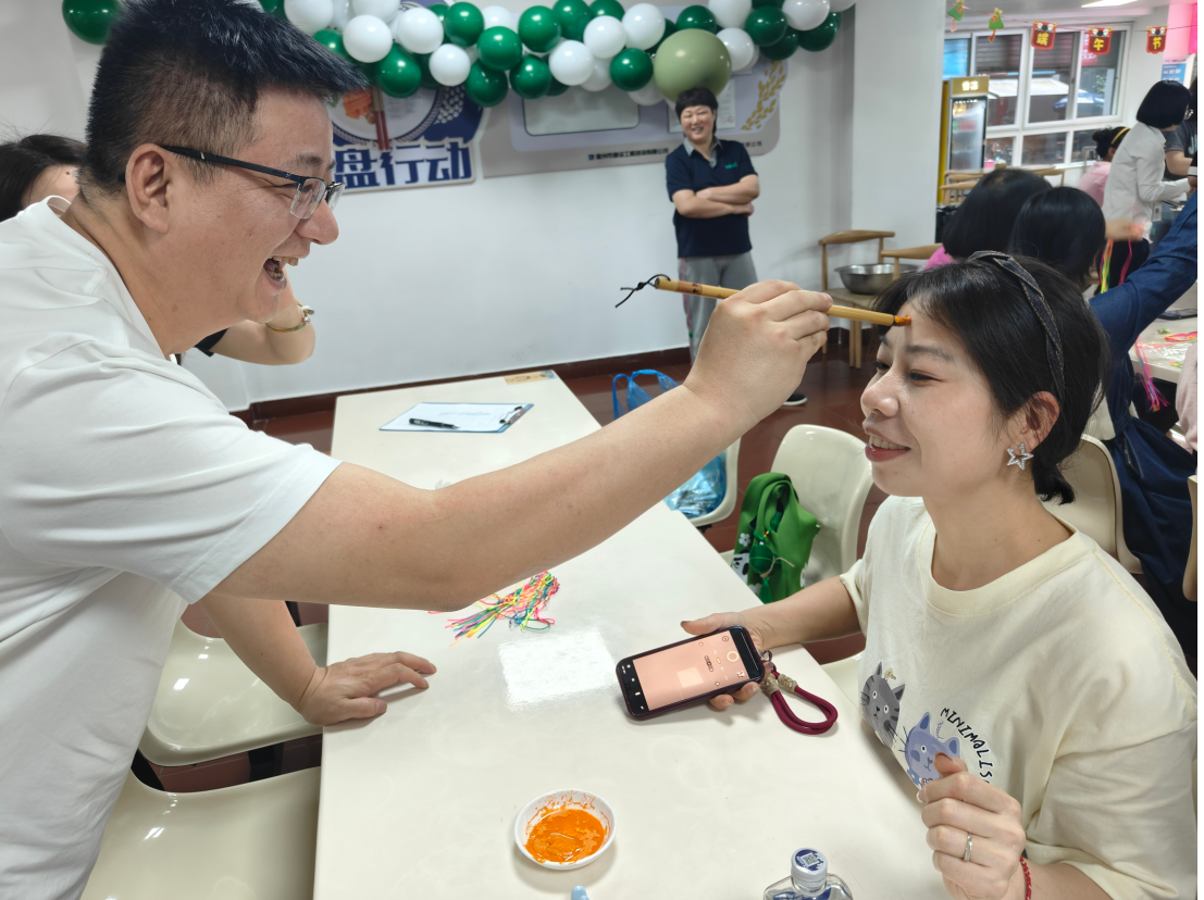 除了包粽子外,還組織了縫香包、編蛋袋、撞蛋、點(diǎn)額等形式多樣的活動(dòng)。其中點(diǎn)額儀式則是端午節(jié)活動(dòng)中的一項(xiàng)重要儀式。現(xiàn)場(chǎng)擺放著雄黃酒和艾草制品,大家將雄黃酒點(diǎn)在額頭、耳后、手腕等處,雄黃酒香氣四溢、艾草清香撲鼻,構(gòu)成了端午獨(dú)特的氣息,這不僅是對(duì)傳統(tǒng)文化的尊重與傳承,更是讓我們?cè)诂F(xiàn)代生活中仍感受到那份來(lái)自古代的智慧與關(guān)懷。